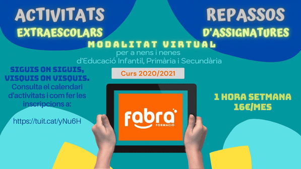 Aquest curs 2020/2021, serà un curs especial arrel la situació excepcional provinguda pel COVID-19 i des de Fabra Formació volem donar el recolzament a les famílies i als nens i nenes per a què us encaixi tot una mica millor.