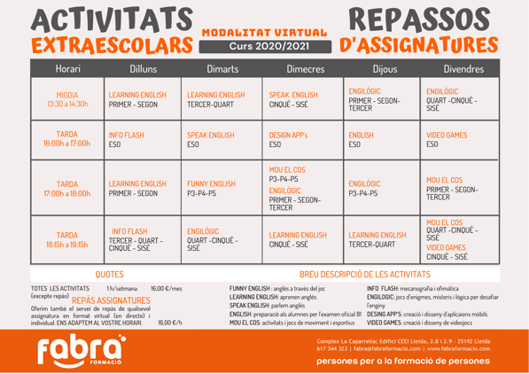Aquí trobaràs el planing d'activitats extraescolars en format virtual que proposem per al curs 2020/2021, amb els respectius horaris, cursos i quotes.